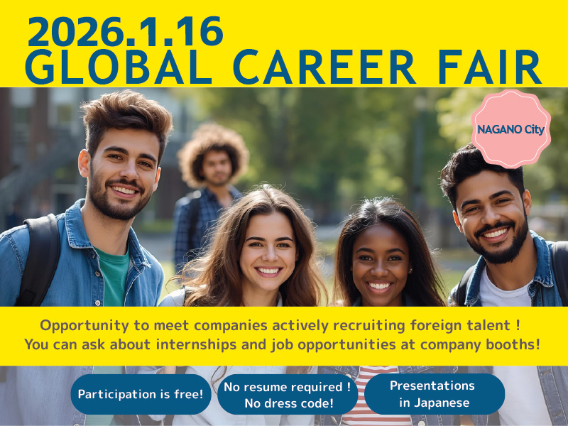The Nagano Prefecture Foreign Talent Matching Support Desk will hold the Global Career Fair in Nagano City for international students and JET Programme participants and alumni living mainly in Nagano Prefecture.